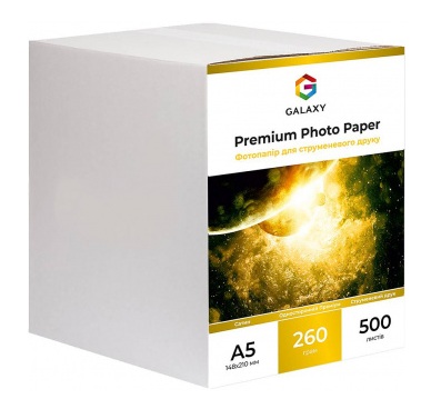 Фотопапір преміум сатин Galaxy А5 має високу щільність листа 260 г/м2 та мікропористу багатошарову структуру, завдяки чому чорнило миттєво вбираються і швидко закріплюються. При друку можна використовувати водорозчинні або пігментні чорнила.